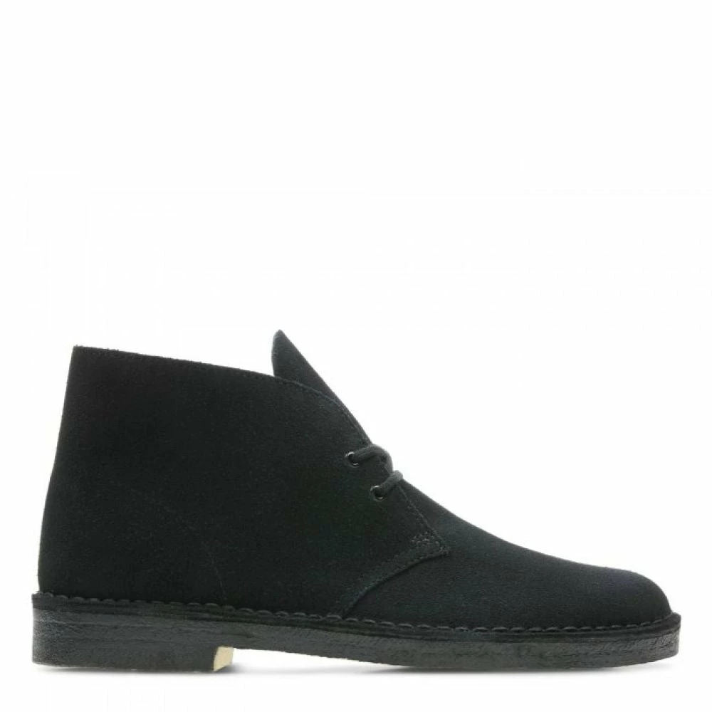 Cultural cachet and design DNA: no shoe is quite like the Clarks Originals Desert Boot. Nathan Clark’s 1950 design was inspired by a rough boot from Cairo’s Old Bazaar, and its minimal, progressive style sparked a worldwide footwear revolution – worn by beatniks, mods, Britpop bands, and Jamaican rude boys, from Paris to Kingston, Tokyo to London. Every design detail today remains true to that first pioneering pair – here, the boot’s crafted, clean lines are enhanced with premium black suede, finished with an unfussy lace fastening. The authentic, sustainably sourced crepe sole completes this distinctive silhouette. Instantly recognizable, forever iconic. A true original.